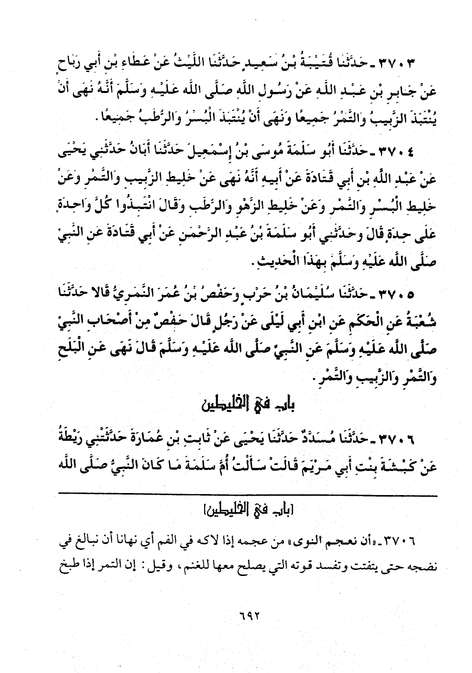 3704 - حَدَّثَنَا أَبُو سَلَمَةَ مُوسَى بْنُ إِسْمَاعِيلَ، حَدَّثَنَا أَبَانُ، حَدَّثَنِي يَحْيَى، عَنْ عَبْدِ اللَّهِ بْنِ أَبِي قَتَادَةَ، عَنْ أَبِيهِ، «أَنَّهُ نَهَى عَنْ خَلِيطِ الزَّبِيبِ، وَالتَّمْرِ، وَعَنْ خَلِيطِ الْبُسْرِ وَالتَّمْرِ، وَعَنْ خَلِيطِ الزَّهْوِ، وَالرُّطَبِ، وَقَالَ، انْتَبِذُوا كُلَّ وَاحِدَةٍ عَلَى حِدَةٍ» قَالَ: وحَدَّثَنِي أَبُو سَلَمَةَ بْنُ عَبْدِ الرَّحْمَنِ، عَنْ أَبِي قَتَادَةَ، عَنِ النَّبِيِّ صَلَّى اللهُ عَلَيْهِ وَسَلَّمَ بِهَذَا الْحَدِيثِ.