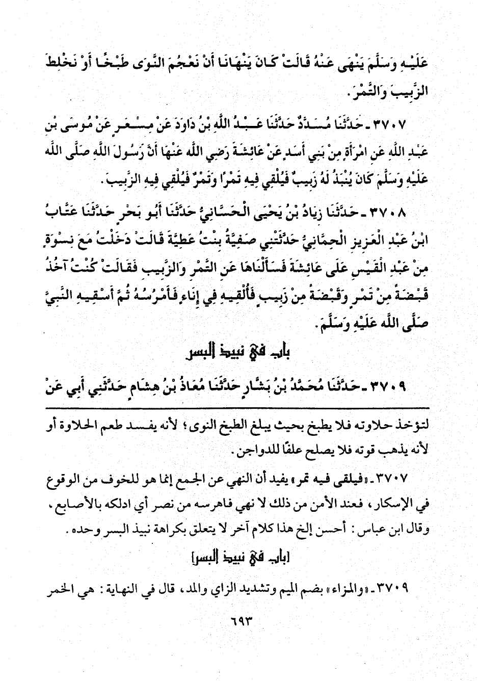 3707 - "فيلقى فيه تمر" يفيد أن النهي عن الجمع إنما هو للخوف من الوقوع في الإسكار، فعند الأمن من ذلك لا نهي فاهرسه من نصر أي ادلكه بالأصابع، وقال ابن عباس: أحسن إلخ هذا كلام آخر لا يتعلق بكراهة نبيذ البسر وحده.