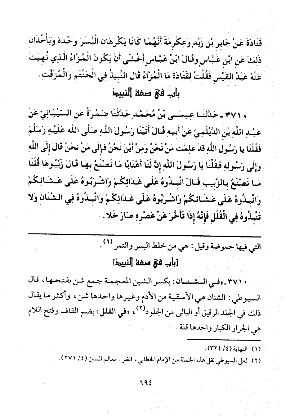 3710 - "في الشنان" بكسر الشين المعجمة جمع شن بفتحهما، قال السيوطي: الشنان هي الأسقية من الأدم وغيوها واحدها شن، وأكثر ما يقال ذلك في الجلد الرقق أو البالي من الجلود (¬2)، "في القلل" بضم القاف وفتح اللام هي الجرار الكبار واحدها قلة.