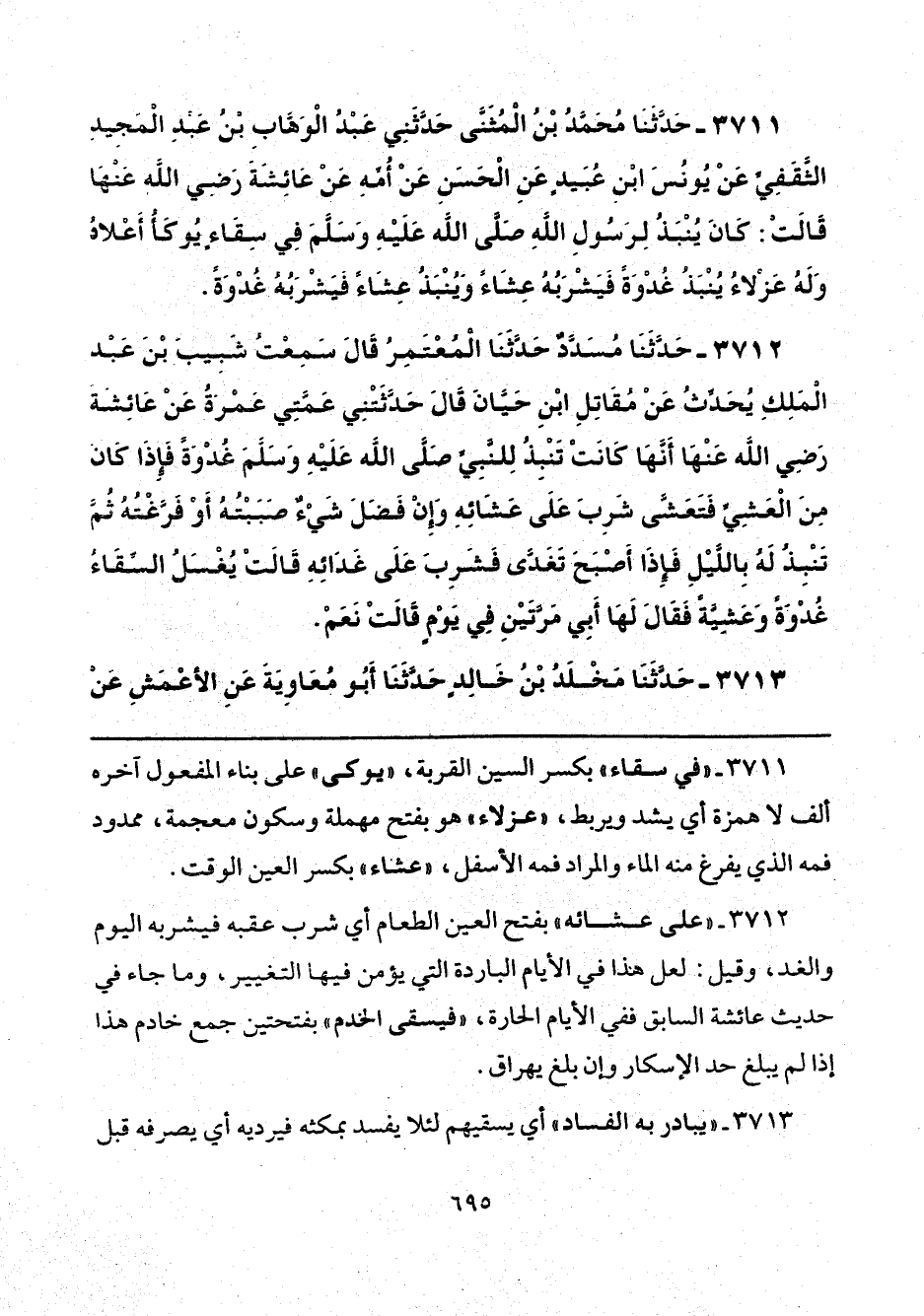 3711 - "في سقاء" بكسر السين القربة، "يوكى" على بناء المفعول آخره ألف لا همزة أي يشد ويربط، "عزلاء" هو بفتح مهملة ومعكون معجمة، ممدود فمه الذي يفرغ منه الماء والمراد فمه الأسفل، "عشاء" بكسر العين الوقت.