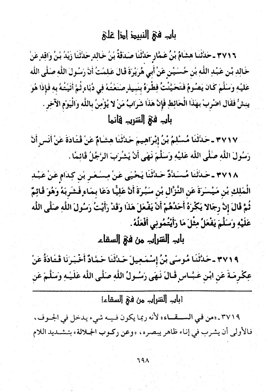 3717 - حَدَّثَنَا مُسْلِمُ بْنُ إِبْرَاهِيمَ، حَدَّثَنَا هِشَامٌ، عَنْ قَتَادَةَ، عَنْ أَنَسٍ، أَنَّ رَسُولَ اللَّهِ صَلَّى اللهُ عَلَيْهِ وَسَلَّمَ: «نَهَى أَنْ يَشْرَبَ الرَّجُلُ قَائِمًا».