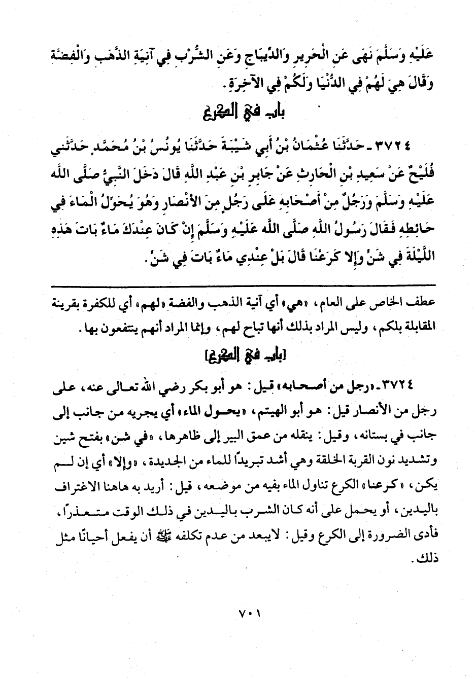 3724 - حَدَّثَنَا عُثْمَانُ بْنُ أَبِي شَيْبَةَ، حَدَّثَنَا يُونُسُ بْنُ مُحَمَّدٍ، حَدَّثَنِي فُلَيْحٌ، عَنْ سَعِيدِ بْنِ الْحَارِثِ، عَنْ جَابِرِ بْنِ عَبْدِ اللَّهِ، قَالَ: دَخَلَ النَّبِيُّ صَلَّى اللهُ عَلَيْهِ وَسَلَّمَ: وَرَجُلٌ مِنْ أَصْحَابِهِ عَلَى رَجُلٍ مِنَ الْأَنْصَارِ وَهُوَ يُحَوِّلُ الْمَاءَ فِي حَائِطِهِ، فَقَالَ رَسُولُ اللَّهِ صَلَّى اللهُ عَلَيْهِ وَسَلَّمَ: «إِنْ كَانَ عِنْدَكَ مَاءٌ بَاتَ هَذِهِ اللَّيْلَةَ فِي شَنٍّ، وَإِلَّا كَرَعْنَا» قَالَ: بَلْ عِنْدِي مَاءٌ بَاتَ فِي شَنٍّ.
