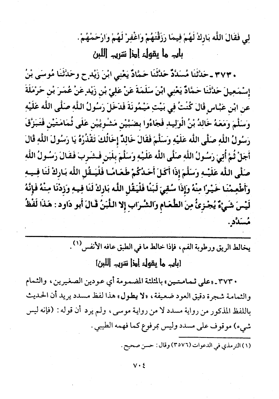 3730 - حَدَّثَنَا مُسَدَّدٌ، حَدَّثَنَا حَمَّادٌ يَعْنِي ابْنَ زَيْدٍ، ح وحَدَّثَنَا مُوسَى بْنُ إِسْمَاعِيلَ، حَدَّثَنَا حَمَّادٌ يَعْنِي ابْنَ سَلَمَةَ، عَنْ عَلِيِّ بْنِ زَيْدٍ، عَنْ عُمَرَ بْنِ حَرْمَلَةَ، عَنِ ابْنِ عَبَّاسٍ، قَالَ: كُنْتُ فِي بَيْتِ مَيْمُونَةَ فَدَخَلَ رَسُولُ اللَّهِ صَلَّى اللهُ عَلَيْهِ وَسَلَّمَ وَمَعَهُ خَالِدُ بْنُ الْوَلِيدِ فَجَاءُوا بِضَبَّيْنِ مَشْوِيَّيْنِ عَلَى ثُمَامَتَيْنِ، فَتَبَزَّقَ رَسُولُ اللَّهِ صَلَّى اللهُ عَلَيْهِ وَسَلَّمَ فَقَالَ خَالِدٌ: إِخَالُكَ تَقْذُرُهُ يَا رَسُولَ اللَّهِ، قَالَ «أَجَلْ» ثُمَّ أُتِيَ رَسُولُ اللَّهِ صَلَّى اللهُ عَلَيْهِ وَسَلَّمَ بِلَبَنٍ فَشَرِبَ، فَقَالَ رَسُولُ اللَّهِ صَلَّى اللهُ عَلَيْهِ وَسَلَّمَ إِذَا أَكَلَ أَحَدُكُمْ طَعَامًا فَلْيَقُلْ: اللَّهُمَّ بَارِكْ لَنَا فِيهِ، وَأَطْعِمْنَا خَيْرًا مِنْهُ، وَإِذَا سُقِيَ لَبَنًا فَلْيَقُلْ: اللَّهُمَّ بَارِكْ لَنَا فِيهِ، وَزِدْنَا مِنْهُ، فَإِنَّهُ لَيْسَ شَيْءٌ يُجْزِئُ مِنَ الطَّعَامِ وَالشَّرَابِ إِلَّا اللَّبَنُ قَالَ أَبُو دَاوُدَ: «هَذَا لَفْظُ مُسَدَّدٍ».