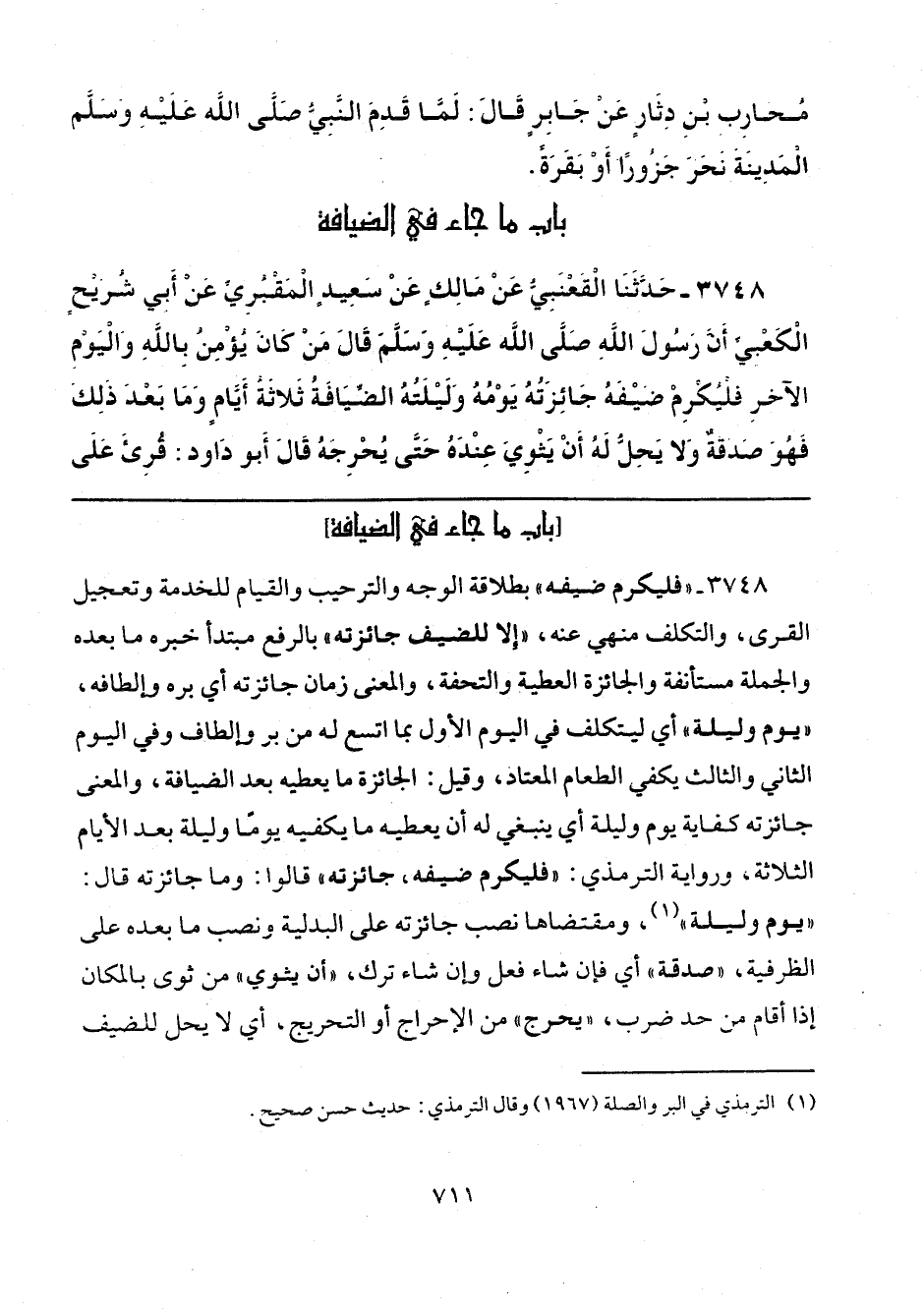 3748 - "فليكرم ضيفه" بطلاقة الوجه والترحيب والقيام للخدمة وتعجيل القرى، والتكلف منهي عنه، "إلا للضيف جائزته" بالرفع مبتدأ خبره بعده والجملة مستأنفة والجائزة العطية والتحفة، والمعنى زمان جائزته أي بره وإلطافه، "يوم وليلة" أي ليتكلف في اليوم الأول بما اتسع له من بر إلطاف وفي اليوم الثاني والثالث يكفي الطعام المعتاد، وقل: الجائزة ما يعطيه بعد الضيافة، والمعنى جائزته كفاية يوم وليلة أي ينبغي له أن يعطيه ما يكفيه يومًا ولية بعد الأيام الثلاثة ورواية الترمذي: "فليكرم ضيفه، جائزته" قالوا: وما جائزته قال: "يوم وليلة" (¬1)، ومقتضاها نصب جائزته على البدلية ونصب ما بعده على الظرفية، "صدقة" أي فإن شاء فعل فإن شاء ترك، "أن يثوي" من ثوى بالمكان إذا أقام من حد ضرب، "يحرج" من الإحراج أو التحريج أي لا يحل للضيف