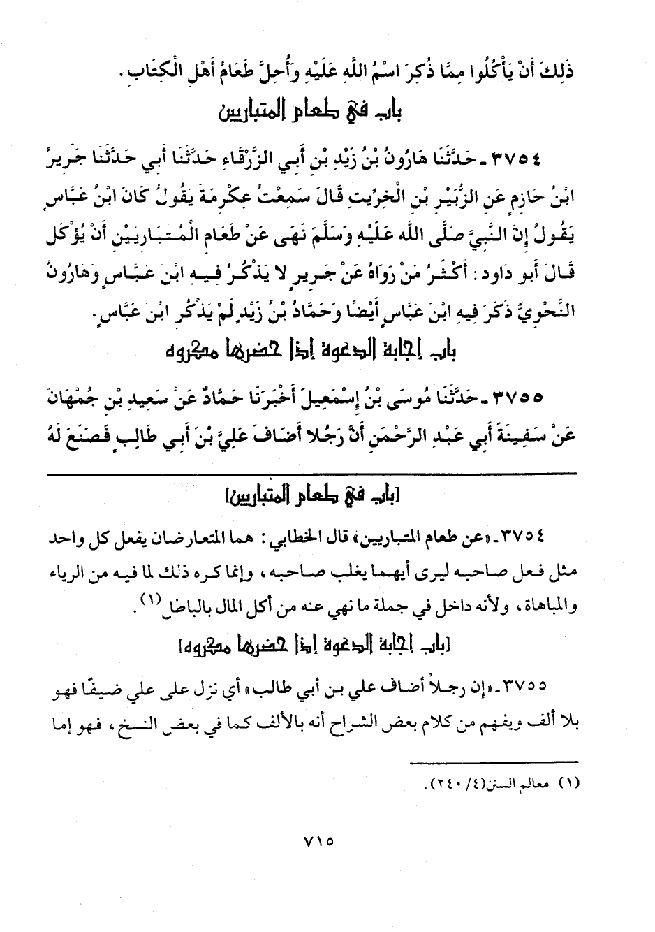 3754 - "عن طعام المتباريين" قال الخطابي: هما المتعارضان يفعل كل واحد مثل فعل صاحبه ليرى أيهما يغلب صاحبه، وإنما كره ذلك لما فيه من الرياء والمباهاة، ولأنه داخل في جملة ما نهي عنه من أكل المال بالباطل (¬1).