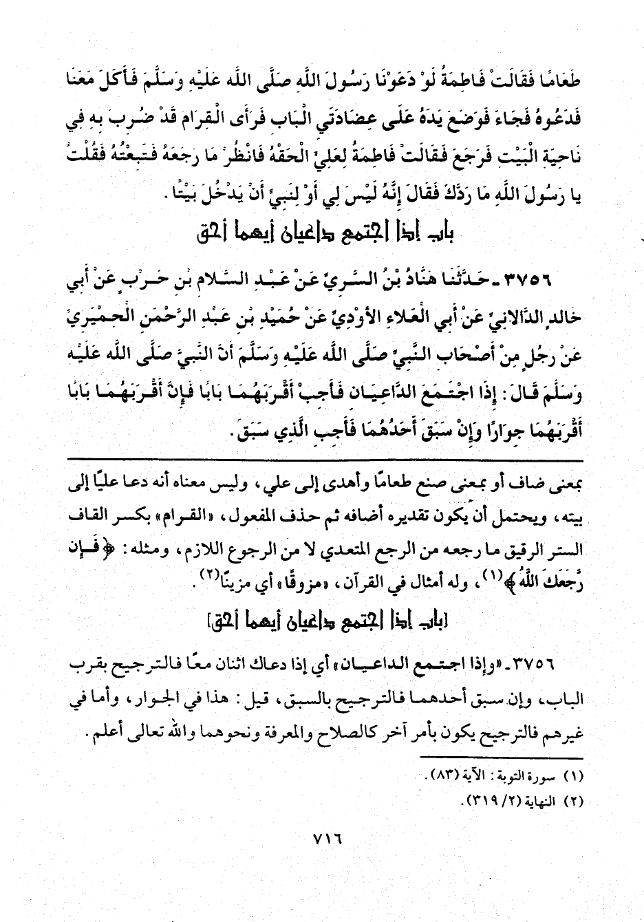 3756 - "وإذا اجتمع الداعيان" أي إذا دعاك اثنان معًا فالترجيح بقرب الباب، وإن سبق أحدهما فالترجيح بالسبق، قيل: هذا في الجوار، وأما في غيرهم فالترجيح يكون بأمر آخر كالصلاح والمعرفة ونحوهما والله تعالى أعلم.
