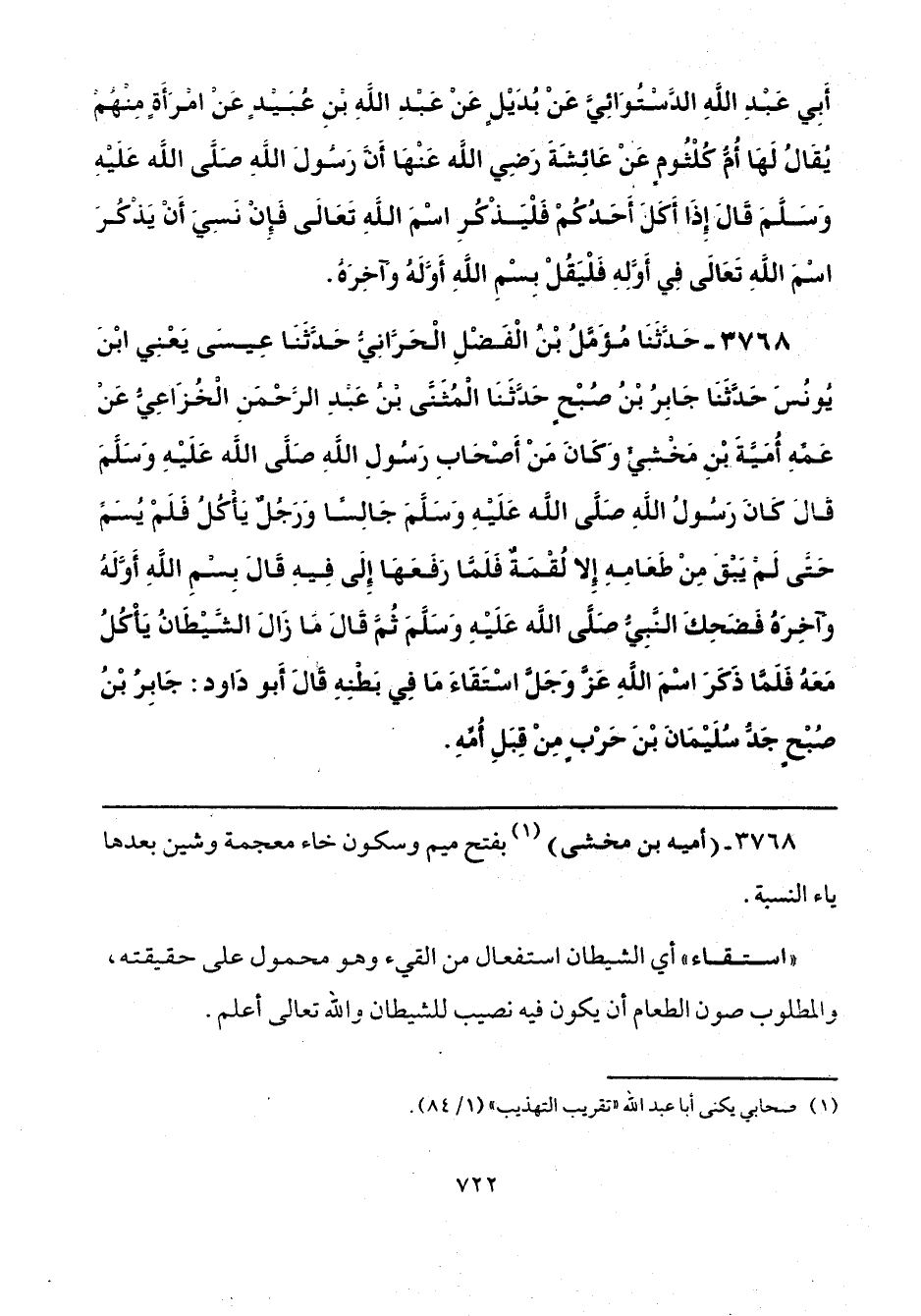 3768 - حَدَّثَنَا مُؤَمَّلُ بْنُ الْفَضْلِ الْحَرَّانِيُّ، حَدَّثَنَا عِيسَى يَعْنِي ابْنَ يُونُسَ، حَدَّثَنَا جَابِرُ بْنُ صُبْحٍ، حَدَّثَنَا الْمُثَنَّى بْنُ عَبْدِ الرَّحْمَنِ الْخُزَاعِيُّ، عَنْ عَمِّهِ أُمَيَّةَ بْنِ مَخْشِيٍّ - وَكَانَ مَنْ أَصْحَابِ رَسُولِ اللَّهِ صَلَّى اللهُ عَلَيْهِ وَسَلَّمَ - قَالَ: كَانَ رَسُولُ اللَّهِ صَلَّى اللهُ عَلَيْهِ وَسَلَّمَ جَالِسًا وَرَجُلٌ يَأْكُلُ فَلَمْ يُسَمِّ حَتَّى لَمْ يَبْقَ مِنْ طَعَامِهِ إِلَّا لُقْمَةٌ فَلَمَّا رَفَعَهَا إِلَى فِيهِ قَالَ: بِسْمِ اللَّهِ أَوَّلَهُ وَآخِرَهُ، فَضَحِكَ النَّبِيُّ صَلَّى اللهُ عَلَيْهِ وَسَلَّمَ ثُمَّ قَالَ: «مَا زَالَ الشَّيْطَانُ يَأْكُلُ مَعَهُ، فَلَمَّا ذَكَرَ اسْمَ اللَّهِ عَزَّ وَجَلَّ اسْتَقَاءَ مَا فِي بَطْنِهِ» قَالَ أَبُو دَاوُدَ: «جَابِرُ بْنُ صُبْحٍ جَدُّ سُلَيْمَانَ بْنَ حَرْبٍ مِنْ قِبَلِ أُمِّهِ».