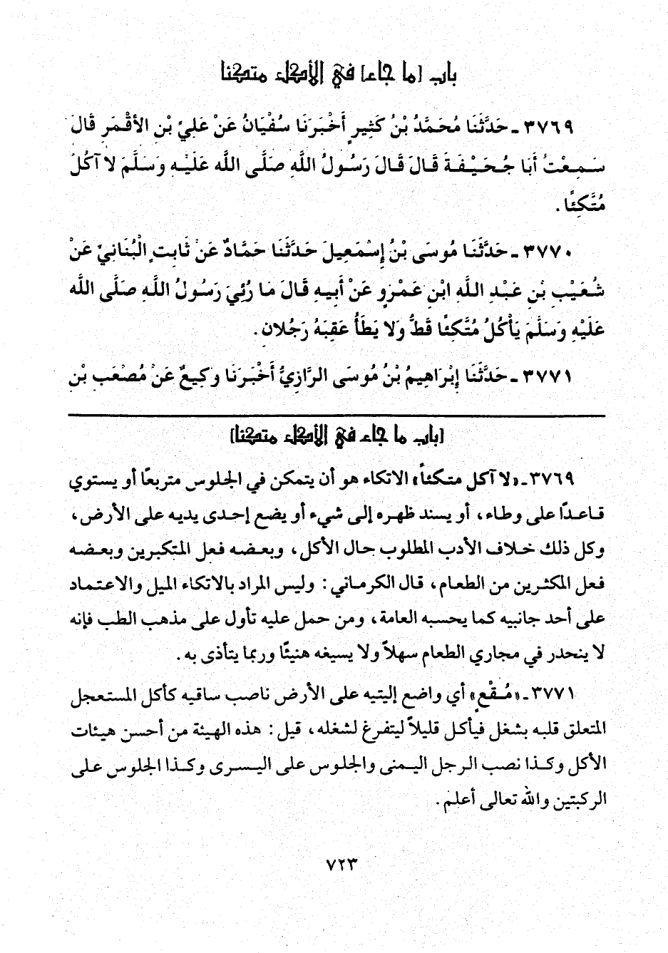 3769 - "لا آكل متكئًا"، الاتكاء هو أن يتمكن في الجلوس متربعًا أو يستوي قاعدًا على وطاء، أو يسند ظهره إلى شيء أو يضع إحدى يديه على الأرض، وكل ذلك خلاف الأدب المطلوب حال الأكل، وبعضه فعل المتكبرين وبعضه فعل المكثرين من الطعام، قال الكرماني: وليس المراد بالاتكاء الميل والاعتماد على أحد جانبيه كما يحسبه العامة، ومن حمل عليه تأول على مذهب الطب فإنه لا ينحدر في مجاري الطعام سهلًا ولا يسيغه هنيئًا وربما يتأذى به.