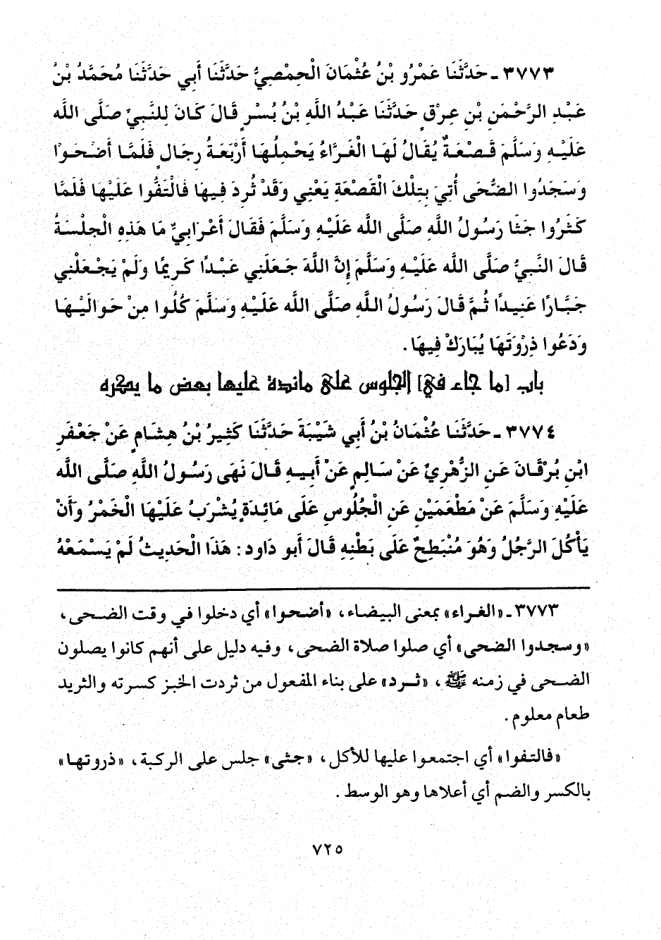 3773 - حَدَّثَنَا عَمْرُو بْنُ عُثْمَانَ الْحِمْصِيُّ، حَدَّثَنَا أَبِي، حَدَّثَنَا مُحَمَّدُ بْنُ عَبْدِ الرَّحْمَنِ بْنِ عِرْقٍ، حَدَّثَنَا عَبْدُ اللَّهِ بْنُ بُسْرٍ، قَالَ: كَانَ لِلنَّبِيِّ صَلَّى اللهُ عَلَيْهِ وَسَلَّمَ قَصْعَةٌ يُقَالُ لَهَا الْغَرَّاءُ يَحْمِلُهَا أَرْبَعَةُ رِجَالٍ، فَلَمَّا أَضْحَوْا وَسَجَدُوا الضُّحَى أُتِيَ بِتِلْكَ الْقَصْعَةِ - يَعْنِي وَقَدْ ثُرِدَ فِيهَا - فَالْتَفُّوا عَلَيْهَا، فَلَمَّا كَثَرُوا جَثَا رَسُولُ اللَّهِ صلّى الله عليه وسلم فَقَالَ أَعْرَابِيٌّ: مَا هَذِهِ الْجِلْسَةُ؟ قَالَ النَّبِيُّ صَلَّى اللهُ عَلَيْهِ وَسَلَّمَ «إِنَّ اللَّهَ جَعَلَنِي عَبْدًا كَرِيمًا، وَلَمْ يَجْعَلْنِي جَبَّارًا عَنِيدًا» ثُمَّ قَالَ رَسُولُ اللَّهِ صَلَّى اللهُ عَلَيْهِ وَسَلَّمَ: «كُلُوا مِنْ حَوَالَيْهَا، وَدَعُوا ذِرْوَتَهَا، يُبَارَكْ فِيهَا».