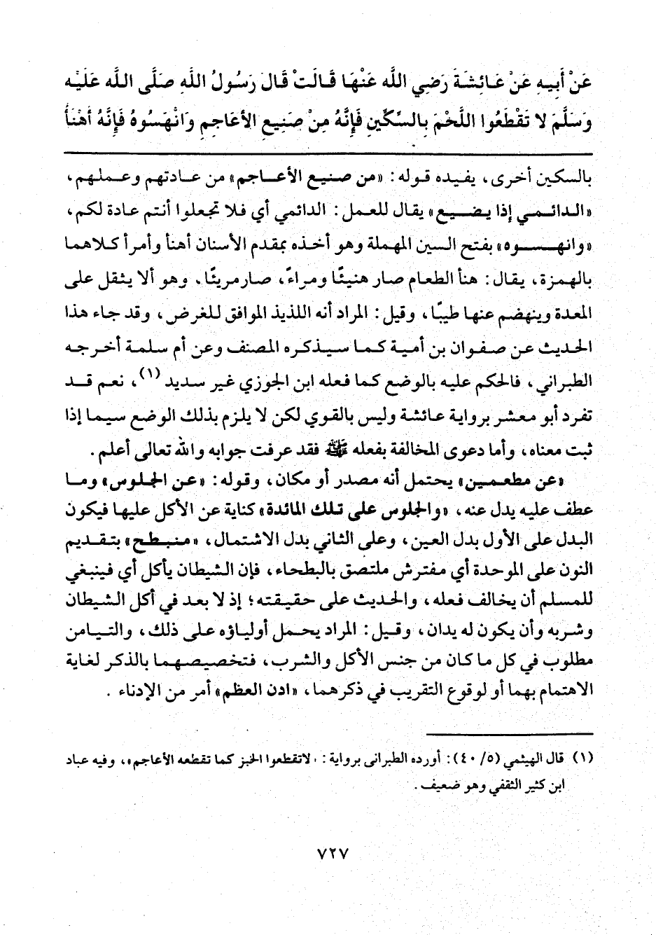 عَنْ أَبِيهِ، عَنْ عَائِشَةَ رَضِيَ اللَّهُ عَنْهَا، قَالَتْ: قَالَ رَسُولُ اللَّهِ صَلَّى اللهُ عَلَيْهِ وَسَلَّمَ: «لَا تَقْطَعُوا اللَّحْمَ بِالسِّكِّينِ فَإِنَّهُ مِنْ صَنِيعِ الْأَعَاجِمِ، وَانْهَسُوهُ فَإِنَّهُ أَهْنَأُ