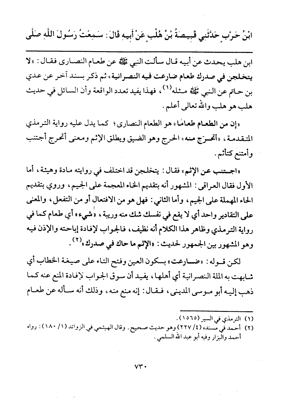 ابن هلب يحدث عن أبيه قال سألت النبي - صلى الله عليه وسلم - عن طعام النصارى فقال: "لا يتخلجن في صدرك طعام ضارعت فيه النصرانية" ثم ذكر بسند آخر عن عدي بن حاتم عن النبي - صلى الله عليه وسلم - مثله (¬1)، فهذا يفيد تعدد الواقعة وأن السائل في حديث هلب هو هلب والله تعالى أعلم.