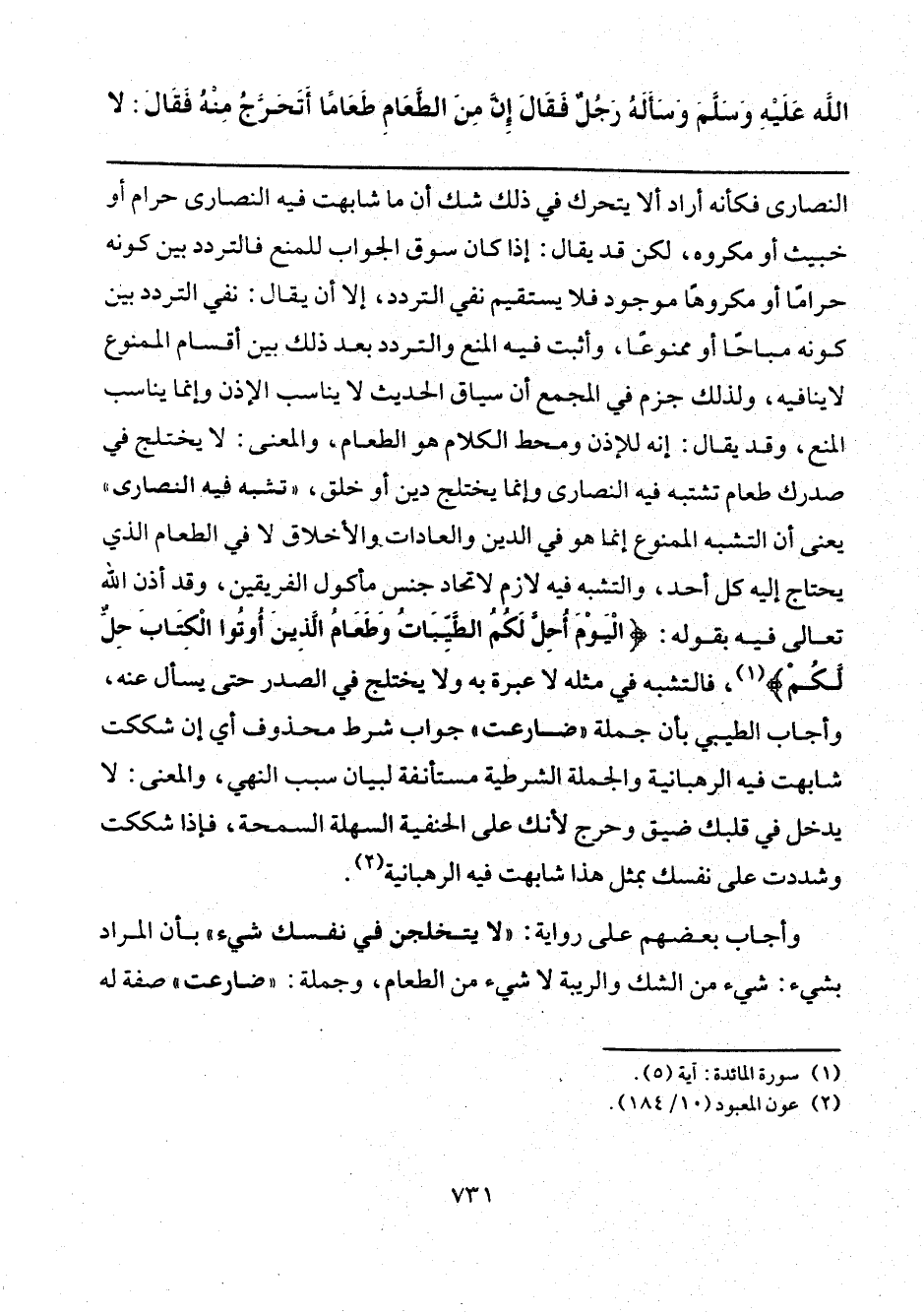 النصارى فكأنه أراد ألا يتحرك في ذلك شك أن ما شابهت فيه النصارى حرام أو خبيث أو مكروه، لكن قد يقال: إذا كان سوق الجواب للمنع فالتردد بين كونه حرامًا أو مكروهًا موجود فلا يستقيم نفي التردد، إلا أن يقال: نفى التردد بين كونه مباحًا أو ممنوعًا، وأثبت فيه المنع والتردد بعد ذلك بين أقسام الممنوع لا ينافيه، ولذلك جزم في المجمع أن سياق الحديث لا يناسب الإذن وإنما يناسب المنع، وقد يقال: إنه للإذن ومحط الكلام هو الطعام، والمعنى: لا يختلج في صدرك طعام تشتبه فيه النصارى وإنما يختلج دين أو خلق، "تشبه فيه النصاري" يعني أن التشبه الممنوع إنما هو في الدين والعادات والأخلاق لا في الطعام الذي يحتاج إليه كل أحد، والتشبه فيه لازم لاتحاد جنس مأكول الفريقين، وقد أذن الله تعالى فيه قوله: {الْيَوْمَ أُحِلَّ لَكُمُ الطَّيِّبَاتُ وَطَعَامُ الَّذِينَ أُوتُوا الْكِتَابَ حِلٌّ لَكُمْ} (¬1)، فالتشبه في مثله لا عبرة به ولا يختلج في الصدر حتى يسأل عنه، وأجاب الطيبي بأن جملة "ضارعت"جواب شرط محذوف أي إن شككت شابهت فيه الرهبانية والجملة الشرطية مستأنفة لبيان سبب النهي، والمعنى: لا يدخل في قلبك ضيق وحرج لأنك على الحنفية السهلة السمحة، فإذا شككت وشددت على نفسك بمثل هذا شابهت فيه الرهبانية (¬2).
