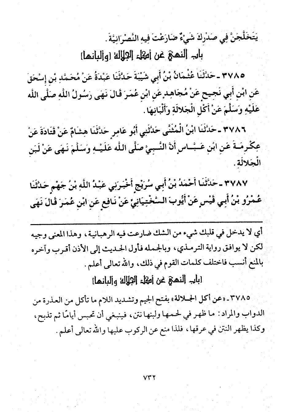 3785 - "عن أكل الجلالة" بفتح الجيم وتشديد اللام ما تأكل من العذرة من الدواب والمراد: ما ظهر في لحمها ولبنها نتن، فينبغي أن تحبس أيامًا ثم تذبح، وكذا يظهر النتن عرقها، فلذا منع عن الركوب عليها والله تعالى أعلم.