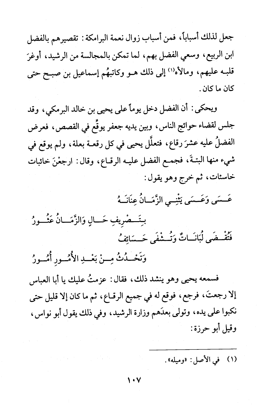 فسمعه يحيى وهو ينشد ذلك، فقال: عزمتُ عليك يا أبا العباس إلا رجعتَ، فرجع، فوقع له في جميع الرقاع، ثم ما كان إلا قليل حتى نكبوا على يده، وتولى بعدَهم وزارة الرشيد، وفي ذلك يقول أبو نواس، وقيل أبو حرزة: