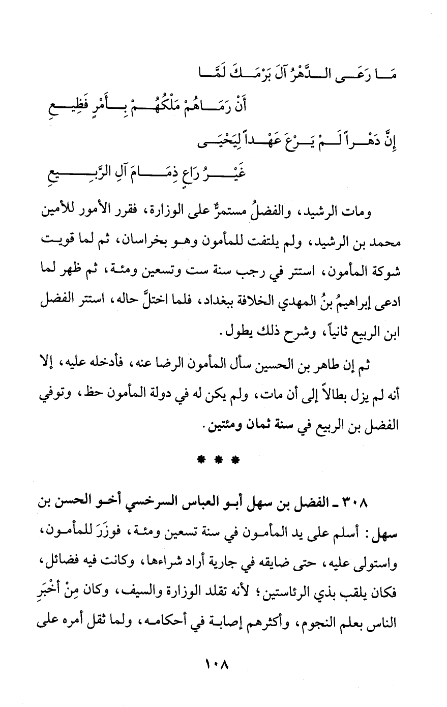 308 - الفضل بن سهل أبو العباس السرخسي أخو الحسن بن سهل: أسلم على يد المأمون في سنة تسعين ومئة، فوزَرَ للمأمون، واستولى عليه، حتى ضايقه في جارية أراد شراءها، وكانت فيه فضائل، فكان يلقب بذي الرئاستين؛ لأنه تقلد الوزارة والسيف، وكان مِنْ أخْبَرِ الناس بعلم النجوم، وأكثرهم إصابة في أحكامه، ولما ثقل أمره على