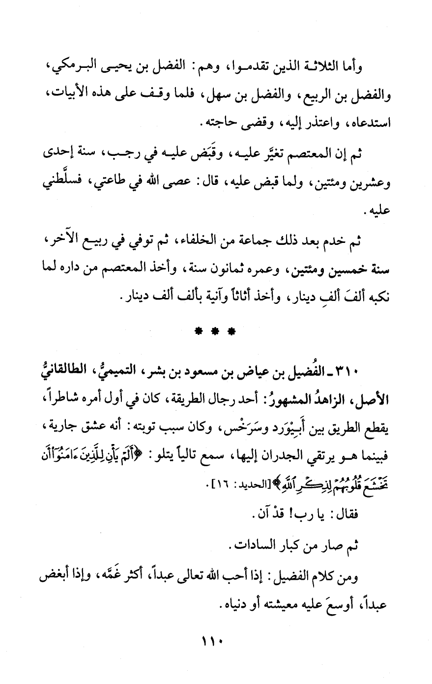 310 - الفُضيل بن عياض بن مسعود بن بشر، التميميُّ، الطالقانيُّ الأصل، الزاهدُ المشهورُ: أحد رجال الطريقة، كان في أول أمره شاطرًا، يقطع الطريق بين أَبِيْوَرد وسَرَخْس، وكان سبب توبته: أنه عشق جارية، فبينما هو يرتقي الجدران إليها، سمع تاليًا يتلو: {أَلَمْ يَأْنِ لِلَّذِينَ آمَنُوا أَنْ تَخْشَعَ قُلُوبُهُمْ لِذِكْرِ اللَّهِ} [الحديد: 16].