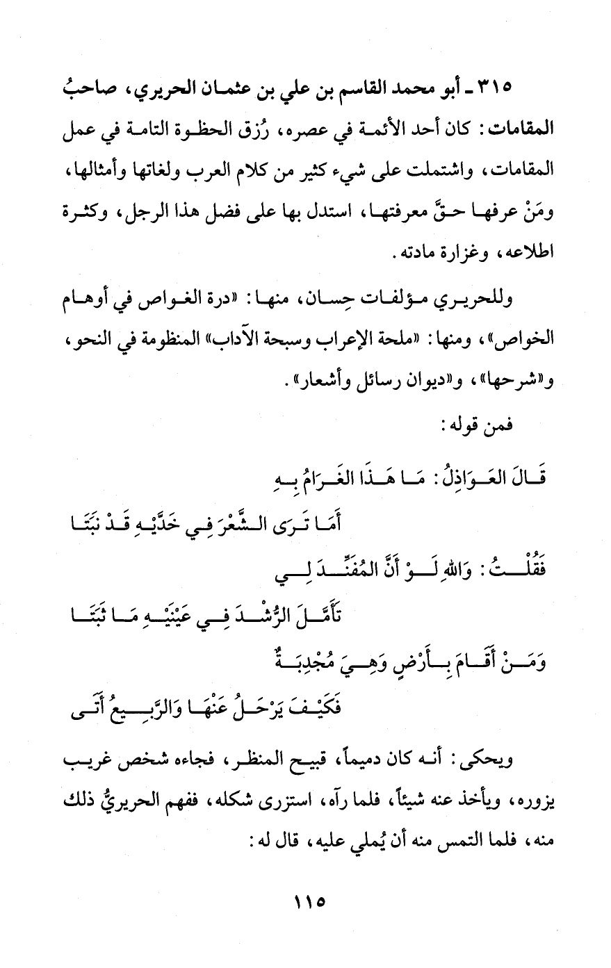 315 - أبو محمد القاسم بن علي بن عثمان الحريري، صاحبُ المقامات: كان أحد الأئمة في عصره، رُزق الحظوة التامة في عمل المقامات، واشتملت على شيء كثير من كلام العرب ولغاتها وأمثالها، ومَنْ عرفها حقَّ معرفتها، استدل بها على فضل هذا الرجل، وكثرة اطلاعه، وغزارة مادته.