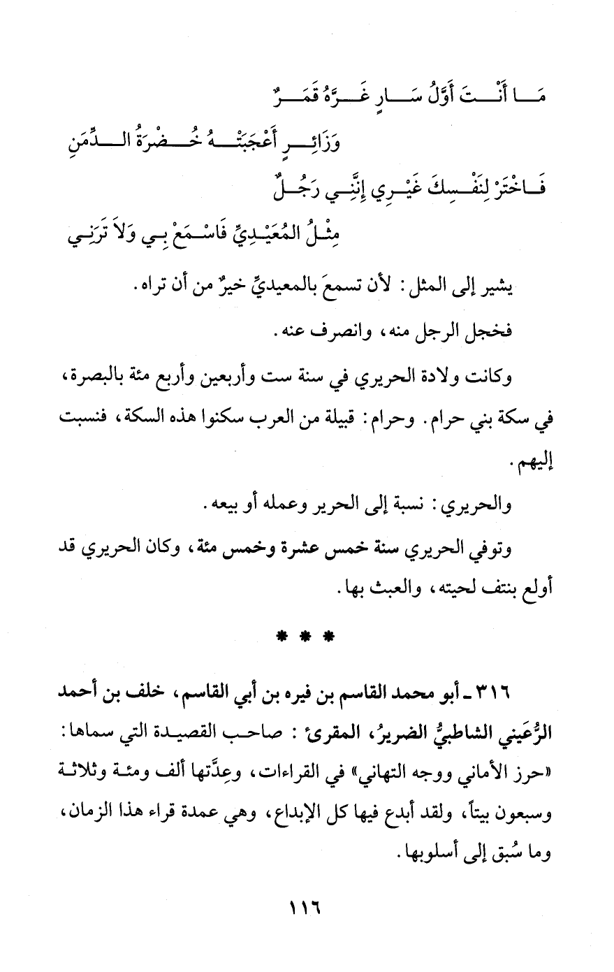 316 - أبو محمد القاسم بن فيره بن أبي القاسم، خلف بن أحمد الرُّعَيني الشاطبيُّ الضريرُ، المقرئ: صاحب القصيدة التي سماها: "حرز الأماني ووجه التهاني" في القراءات، وعِدَّتها ألف ومئة وثلاثة وسبعون بيتًا، ولقد أبدع فيها كل الإبداع، وهي عمدة قراء هذا الزمان، وما سُبق إلى أسلوبها.