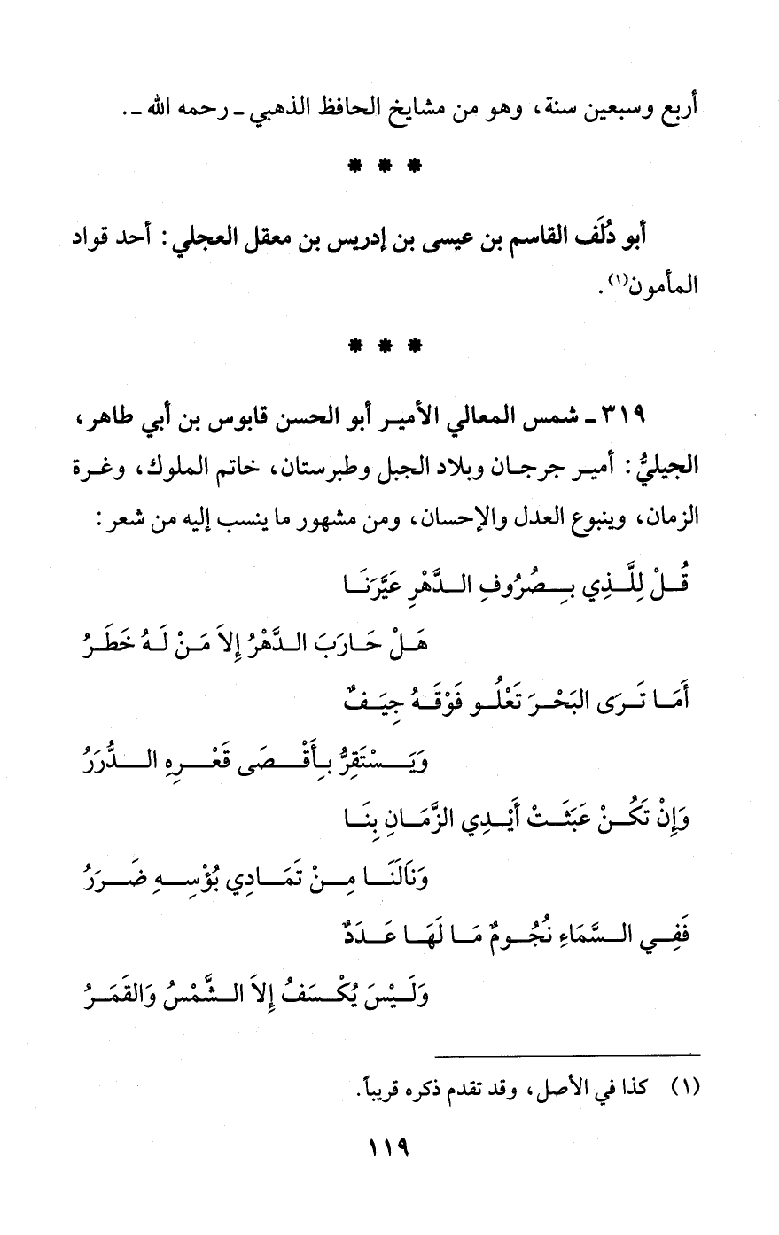 319 - شمس المعالي الأمير أبو الحسن قابوس بن أبي طاهر، الجيليُّ: أمير جرجان وبلاد الجبل وطبرستان، خاتم الملوك، وغرة الزمان، وينبوع العدل والإحسان، ومن مشهور ما ينسب إليه من شعر: