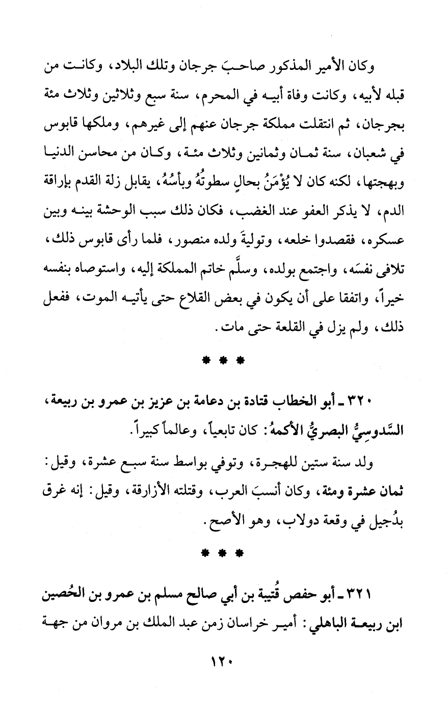 320 - أبو الخطاب قتادة بن دعامة بن عزيز بن عمرو بن ربيعة، السَّدوسِيُّ البصريُّ الأكمهُ: كان تابعيًا، وعالمًا كبيرًا.
