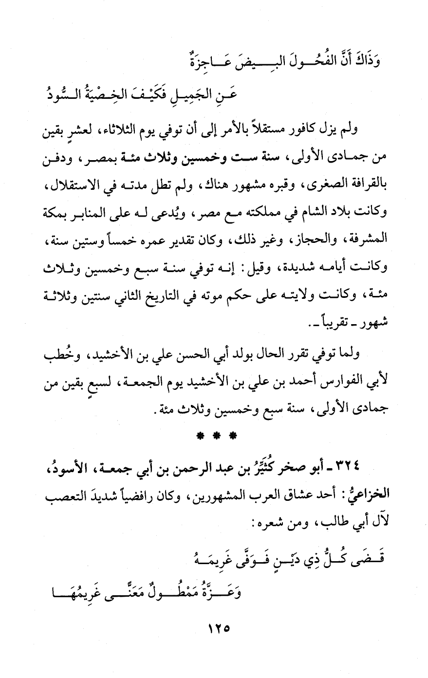 324 - أبو صخر كُثَيِّرُ بن عبد الرحمن بن أبي جمعة، الأسودُ، الخزاعيُّ: أحد عشاق العرب المشهورين، وكان رافضيًا شديدَ التعصب لآل أبي طالب، ومن شعره: