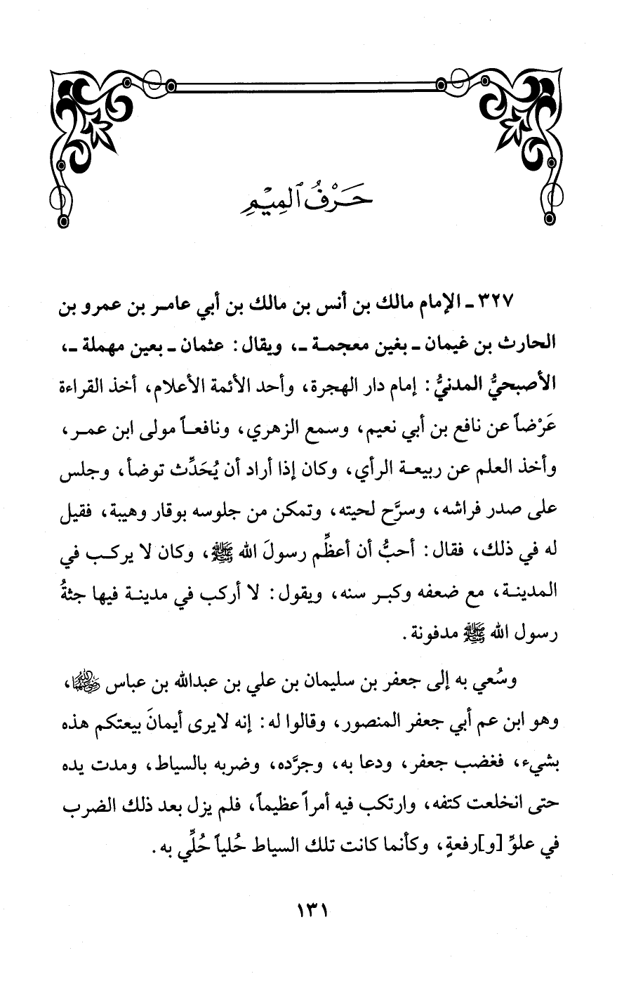 327 - الإمام مالك بن أنس بن مالك بن أبي عامر بن عمرو بن الحارث بن غيمان - بغين معجمة -، ويقال: عثمان - بعين مهملة -، الأصبحيُّ المدنيُّ: إمام دار الهجرة، وأحد الأئمة الأعلام، أخذ القراءة عَرْضًا عن نافع بن أبي نعيم، وسمع الزهري، ونافعًا مولى ابن عمر، وأخذ العلم عن ربيع الرأي، وكان إذا أراد أن يُحَدِّث توضأ، وجلس على صدر فراشه، وسرَّح لحيته، وتمكن من جلوسه بوقار وهيبة، فقيل له في ذلك، فقال: أحبُّ أن أعظِّم رسولَ الله - صلى الله عليه وسلم -، وكان لا يركب في المدينة، مع ضعفه وكبر سنه، ويقول: لا أركب في مدينة فيها جثةُ رسول الله - صلى الله عليه وسلم - مدفونة.