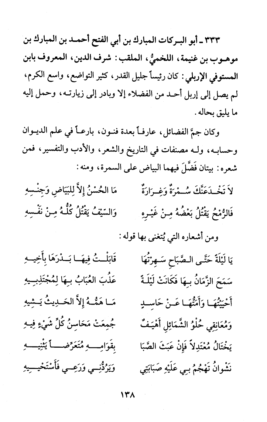 333 - أبو البركات المبارك بن أبي الفتح أحمد بن المبارك بن موهوب بن غنيمة، اللخميُّ، الملقب: شرف الدين، المعروف بابن المستوفي الإربلي: كان رئيسًا جليل القدر، كثير التواضع، واسع الكرم، لم يصل إلى إربل أحد من الفضلاء إلا وبادر إلى زيارته، وحمل إليه ما يليق بحاله.