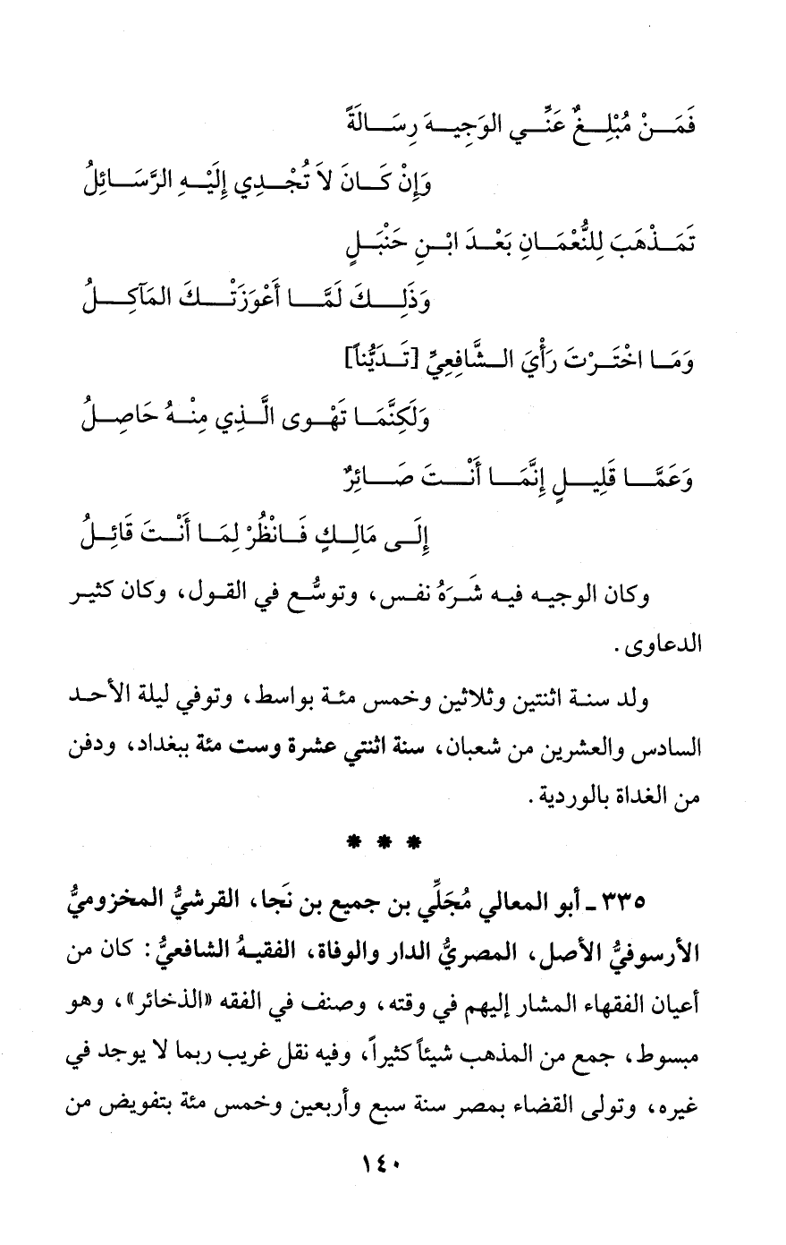 335 - أبو المعالي مُجَلِّي بن جميع بن نَجا، القرشيُّ المخزوميُّ الأرسوفيُّ الأصل، المصريُّ الدار والوفاة، الفقيهُ الشافعيُّ: كان من أعيان الفقهاء المشار إليهم في وقته، وصنف في الفقه "الذخائر"، وهو مبسوط، جمع من المذهب شيئًا كثيرًا، وفيه نقل غريب ربما لا يوجد في غيره، وتولى القضاء بمصر سنة سبع وأربعين وخمس مئة بتفويض من
