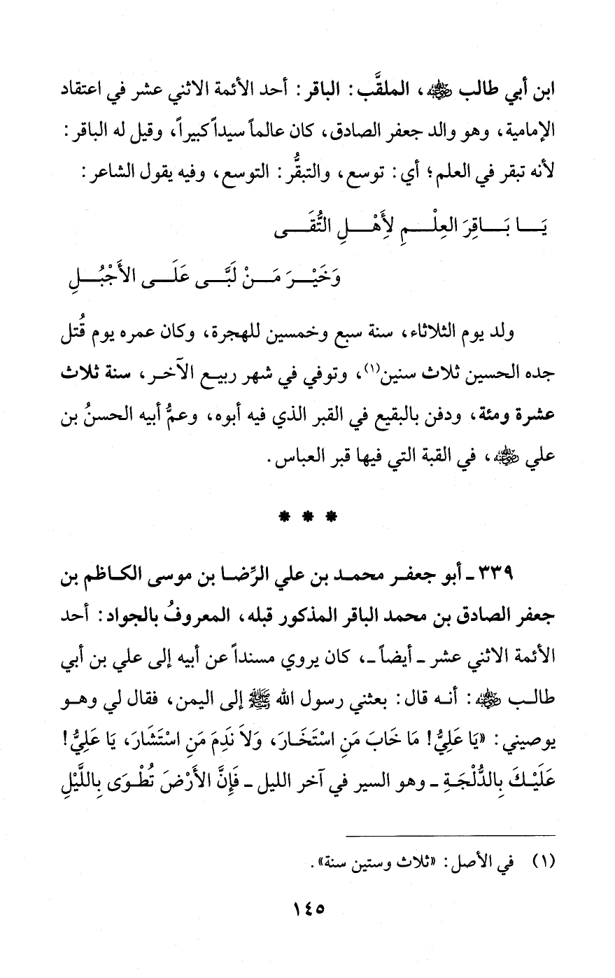 339 - أبو جعفر محمد بن علي الرِّضا بن موسى الكاظم بن جعفر الصادق بن محمد الباقر المذكور قبله، المعروفُ بالجواد: أحد الأئمة الاثني عشر - أيضًا -، كان يروي مسندًا عن أبيه إلى علي بن أبي طالب - رضي الله عنه -: أنه قال: بعثني رسول الله - صلى الله عليه وسلم - إلى اليمن، فقال لي وهو يوصيني: "يَا عَلِيُّ! مَا خَابَ مَنِ اسْتَخَارَ، وَلَا نَدِمَ مَنِ اسْتَشَارَ، يَا عَلِيُّ! عَلَيْكَ بِالدُّلْجَةِ - وهو السير في آخر الليل - فَإِنَّ الأَرْضَ تُطْوَى بِاللَّيْلِ