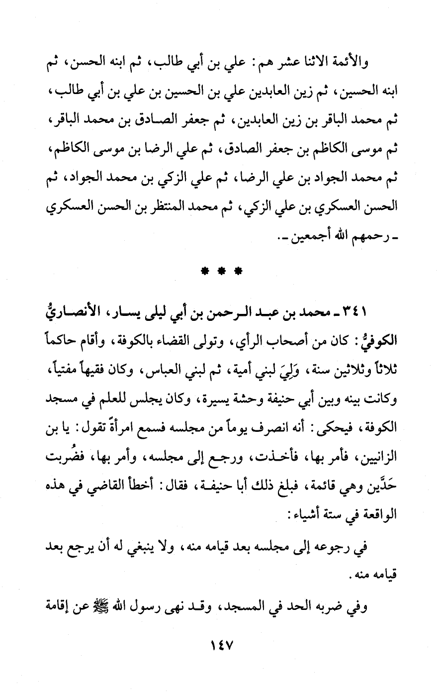 341 - محمد بن عبد الرحمن بن أبي ليلى يسار، الأنصاريُّ الكوفيُّ: كان من أصحاب الرأي، وتولى القضاء بالكوفة، وأقام حاكمًا ثلاثًا وثلاثين سنة، وَلِيَ لبني أمية، ثم لبني العباس، وكان فقيهًا مفتيًا، وكانت بينه وبين أبي حنيفة وحشة يسيرة، وكان يجلس للعلم في مسجد الكوفة، فيحكى: أنه انصرف يومًا من مجلسه فسمع امرأة تقول: يا بن الزانيين، فامر بها، فأخذت، ورجع إلى مجلسه، وأمر بها، فضُربت حَدَّين وهي قائمة، فبلغ ذلك أبا حنيفة، فقال: أخطأ القاضي في هذه الواقعة في ستة أشياء: