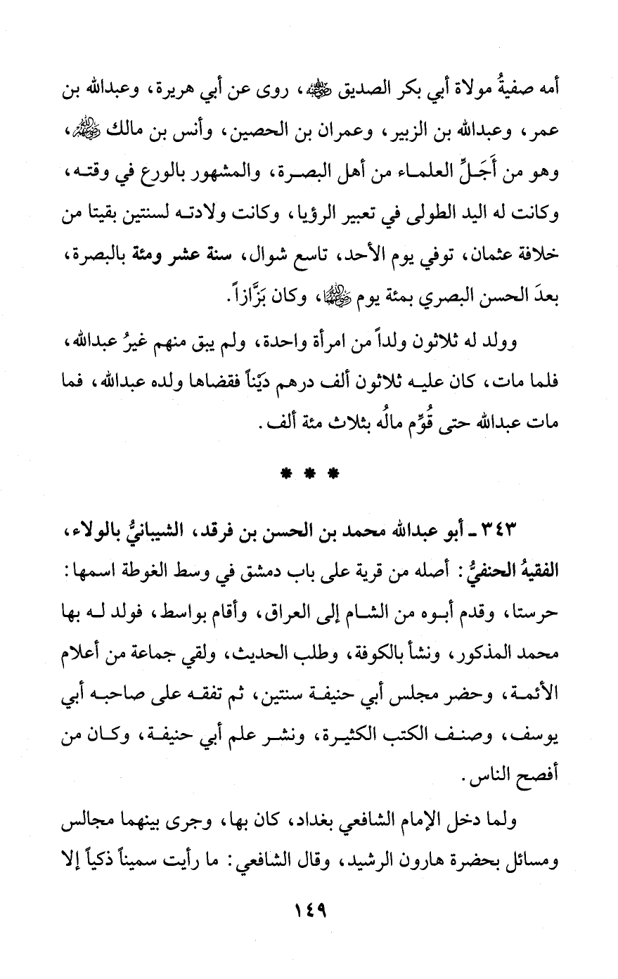 343 - أبو عبد الله محمد بن الحسن بن فرقد، الشيبانيُّ بالولاء، الفقيهُ الحنفيُّ: أصله من قرية على باب دمشق في وسط الغوطة اسمها: حرستا، وقدم أبوه من الشام إلى العراق، وأقام بواسط، فولد له بها محمد المذكور، ونشأ بالكوفة، وطلب الحديث، ولقي جماعة من أعلام الأئمة، وحضر مجلس أبي حنيفة سنتين، ثم تفقه على صاحبه أبي يوسف، وصنف الكتب الكثيرة، ونشر علم أبي حنيفة، وكان من أفصح الناس.