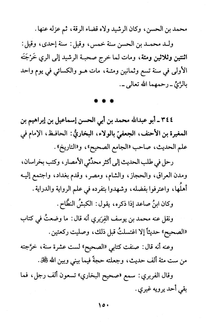 344 - أبو عبد الله محمد بن أبي الحسن إسماعيل بن إبراهيم بن المغيرة بن الأحنف، الجعفيّ بالولاء، البخاريُّ: الحافظ، الإمام في علم الحديث، صاحب "الجامع الصحيح"، و"التاريخ".