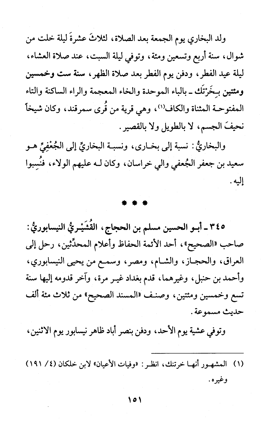 345 - أبو الحسين مسلم بن الحجاج، القُشَيْريُّ النيسابوريّ: صاحب "الصحيح"، أحد الأئمة الحفاظ وأعلام المحدِّثين، رحل إلى العراق، والحجاز، والشام، ومصر، وسمع من يحيى النيسابوري، وأحمد بن حنبل، وغيرهما، قدم بغداد غير مرّة، وآخر قدومه إليها سنة تسع وخمسين ومئتين، وصنف "المسند الصحيح" من ثلاث مئة الف حديث مسموعة.