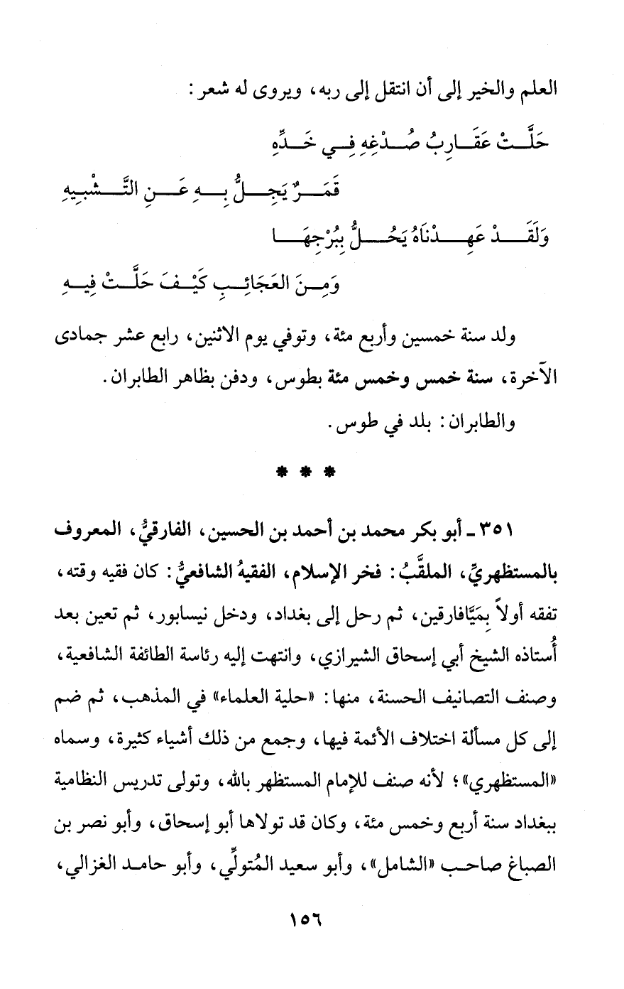 351 - أبو بكر محمد بن أحمد بن الحسين، الفارقيُّ، المعروف بالمستظهريِّ، الملقَّبُ: فخر الإسلام، الفقيهُ الشافعيُّ: كان فقيه وقته، تفقه أولًا بِمَيَّافارقين، ثم رحل إلى بغداد، ودخل نيسابور، ثم تعين بعد أُستاذه الشيخ أبي إسحاق الشيرازي، وانتهت إليه رئاسة الطائفة الشافعية، وصنف التصانيف الحسنة، منها: "حلية العلماء" في المذهب، ثم ضم إلى كل مسألة اختلاف الأئمة فيها، وجمع من ذلك أشياء كثيرة، وسماه "المستظهري"؛ لأنه صنف للإمام المستظهر بالله، وتولى تدريس النظامية ببغداد سنة أربع وخمس مئة، وكان قد تولاها أبو إسحاق، وأبو نصر بن الصباغ صاحب "الشامل"، وأبو سعيد المُتولِّي، وأبو حامد الغزالي،