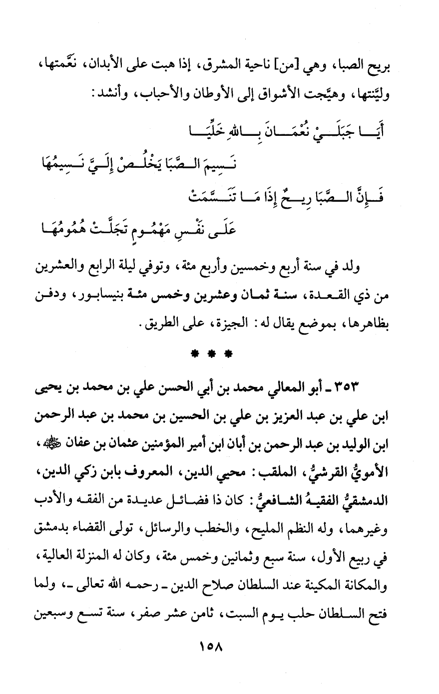 353 - أبو المعالي محمد بن أبي الحسن علي بن محمد بن يحيى ابن علي بن عبد العزيز بن علي بن الحسين بن محمد بن عبد الرحمن ابن الوليد بن عبد الرحمن بن أبان ابن أمير المؤمنين عثمان بن عفان - رضي الله عنه -، الأمويُّ القرشيُّ، الملقب: محيي الدين، المعروف بابن زكلي الدين، الدمشقيُّ الفقيهُ الشافعيُّ: كان ذا فضائل عديدة من الفقه والأدب وغيرهما، وله النظم المليح، والخطب والرسائل، تولى القضاء بدمشق في ربيع الأول، سنة سبع وثمانين وخمس مئة، وكان له المنزلة العالية، والمكانة المكينة عند السلطان صلاح الدين - رحمه الله تعالى -، ولما فتح السلطان حلب يوم السبت، ثامن عشر صفر، سنة تسع وسبعين