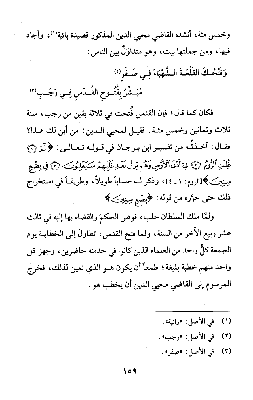 وَفَتْحُكَ القَلْعَةَ الشَّهْبَاءَ فِي صَفَرِ (¬2) ... مُبَشِّرٌ بِفُتُوحِ القُدْسِ فِي رَجَبِ (¬3)