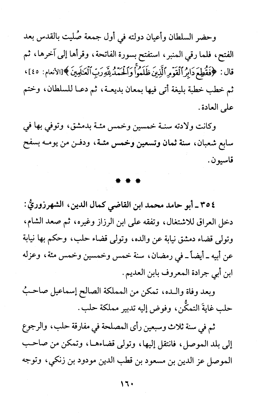 354 - أبو حامد محمد ابن القاضي كمال الدين، الشهرزوريُّ: دخل العراق للاشتغال، وتفقه على ابن الرزاز وغيره، ثم صعد الشام، وتولى قضاء دمشق نيابة عن والده، وتولى قضاء حلب، وحكم بها نيابة عن أبيه - أيضًا - في رمضان، سنة خمس وخمسين وخمس مئة، وعزله ابن أبي جرادة المعروف بابن العديم.