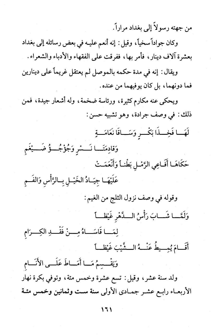 ويحكى عنه مكارم كثيرة، ورئاسة ضخمة، وله أشعار جيدة، فمن ذلك: في وصف جرادة، وهو تشبيه حسن: