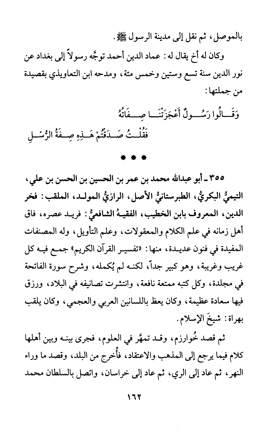 355 - أبو عبد الله محمد بن عمر بن الحسين بن الحسن بن علي، التيميُّ البكريُّ، الطبرستانيُّ الأصل، الرازيُّ المولد، الملقب: فخر الدين، المعروف بابن الخطيب، الفقيهُ الشافعيُّ: فريد عصره، فاق أهل زمانه في علم الكلام والمعقولات، وعلم التأويل، وله المصنفات المفيدة في فنون عديدة، منها: "تفسير القرآن الكريم" جمع فيه كل غريب وغريبة، وهو كبير جدًا، لكنه لم يُكمله، وشرح سورة الفاتحة في مجلدة، وكل كتبه ممتعة نافعة، وانتشرت تصانيفه في البلاد، ورزق فيها سعادة عظيمة، وكان يعظ باللسانين العربي والعجمي، وكان يلقب بهراة: شيخَ الإسلام.