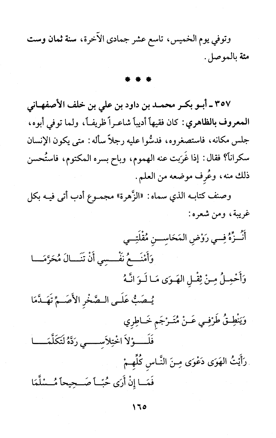 357 - أبو بكر محمد بن داود بن علي بن خلف الأصفهاني المعروف بالظاهري: كان فقيهًا أديبًا شاعرًا ظريفًا، ولما توفي أبوه، جلس مكانه، فاستصغروه، فدسّوا عليه رجلًا سأله: متى يكون الإنسان سكرانًا؟ فقال: إذا غَرَبت عنه الهموم، وباح بسره المكتوم، فاستُحسن ذلك منه، وعُرِف موضعه من العلم.