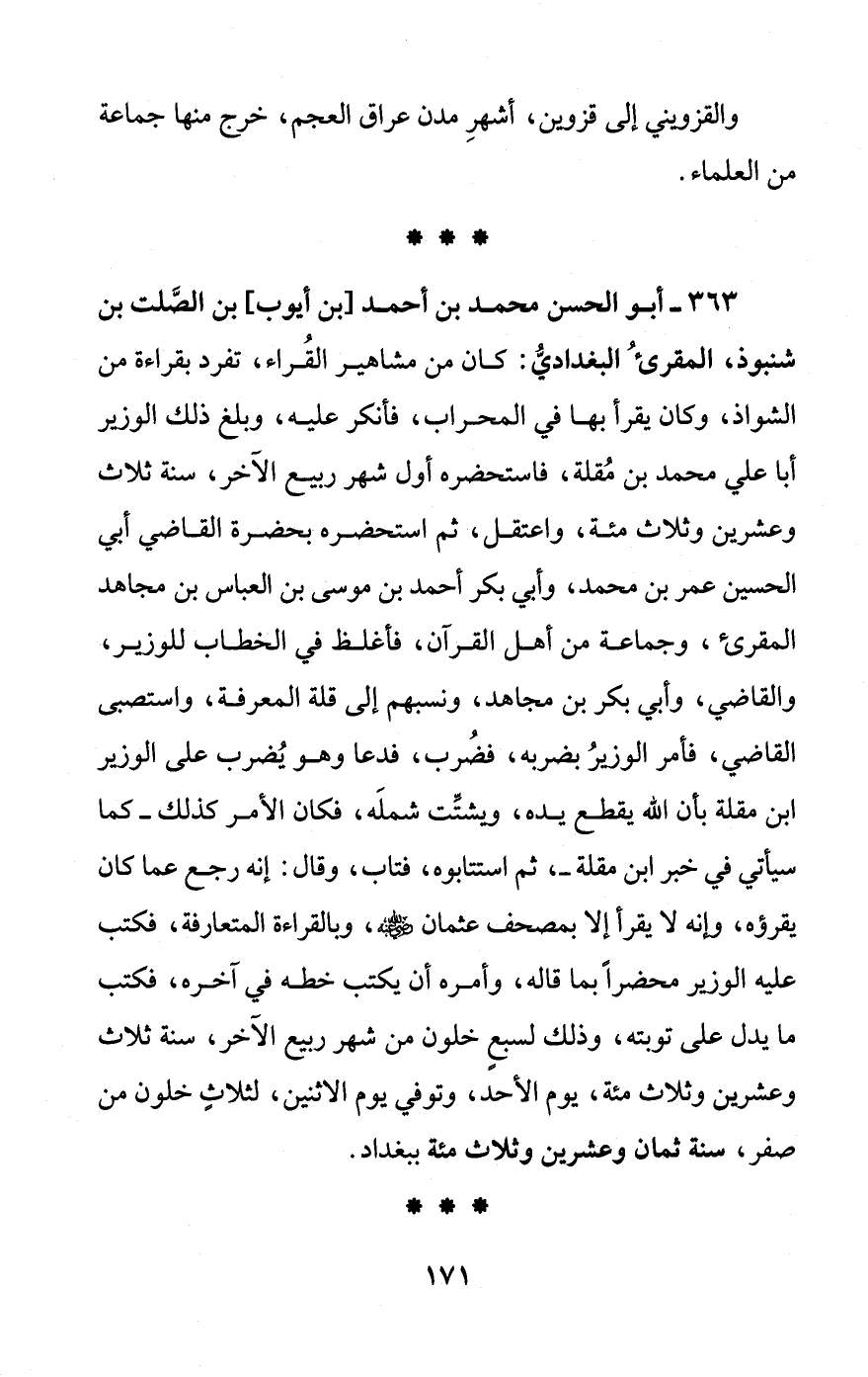 363 - أبو الحسن محمد بن أحمد [بن أيوب] بن الصَّلت بن شنبوذ، المقرئُ البغداديُّ: كان من مشاهير القُراء، تفرد بقراءة من الشواذ، وكان يقرأ بها في المحراب، فأنكر عليه، وبلغ ذلك الوزير أبا علي محمد بن مُقلة، فاستحضره أول شهر ربيع الآخر، سنة ثلاث وعشرين وثلاث مئة، واعتقل، ثم استحضره بحضرة القاضي أبي الحسين عمر بن محمد، وأبي بكر أحمد بن موسى بن العباس بن مجاهد المقرئ، وجماعة من أهل القرآن، فأغلظ في الخطاب للوزير، والقاضي، وأبي بكر بن مجاهد، ونسبهم إلى قلة المعرفة، واستصبى القاضي، فأمر الوزيرُ بضربه، فضُرب، فدعا وهو يُضرب على الوزير ابن مقلة بأن الله يقطع يده، ويشتِّت شملَه، فكان الأمر كذلك - كما سيأتي في خبر ابن مقلة -، ثم استتابوه، فتاب، وقال: إنه رجع عما كان يقرؤه، وإنه لا يقرأ إلا بمصحف عثمان - رضي الله عنه -، وبالقراءة المتعارفة، فكتب عليه الوزير محضرًا بما قاله، وأمره أن يكتب خطه في آخره، فكتب ما يدل على توبته، وذلك لسبع خلون من شهر ربيع الآخر، سنة ثلاث وعشرين وثلاث مئة، يوم الأحد، وتوفي يوم الاثنين، لثلاث خلون من صفر، سنة ثمان وعشرين وثلاث مئة ببغداد.