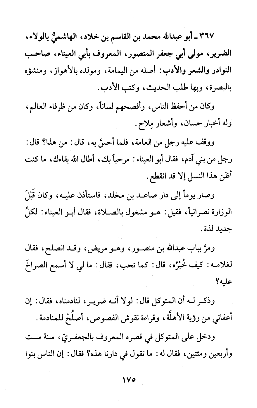 367 - أبو عبد الله محمد بن القاسم بن خلاد، الهاشميُّ بالولاء، الضرير، مولى أبي جعفر المنصور، المعروف بابي العيناء، صاحب النوادر والشعر والأدب: أصله من اليمامة، ومولده بالأهواز، ومنشؤه بالبصرة، وبها طلب الحديث، وكتب الأدب.