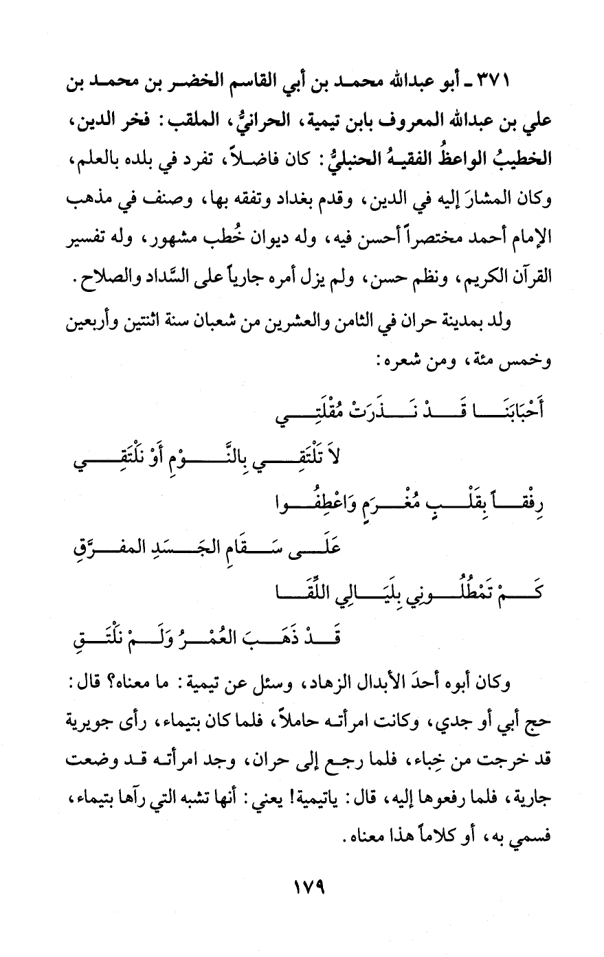 371 - أبو عبد الله محمد بن أبي القاسم الخضر بن محمد بن علي بن عبد الله المعروف بابن تيمية، الحرانيُّ، الملقب: فخر الدين، الخطيبُ الواعظُ الفقيهُ الحنبليُّ: كان فاضلًا، تفرد في بلده بالعلم، وكان المشارَ إليه في الدين، وقدم بغداد وتفقه بها، وصنف في مذهب الإمام أحمد مختصرًا أحسن فيه، وله ديوان خُطب مشهور، وله تفسير القرآن الكريم، ونظم حسن، ولم يزل أمره جاريا على السَّداد والصلاح ولد بمدينة حران في الثامن والعشرين من شعبان سنة اثنتين وأربعين وخمس مئة، ومن شعره: