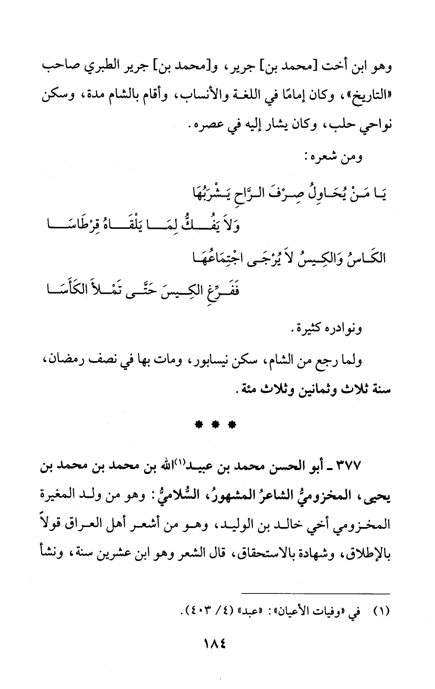 377 - أبو الحسن محمد بن عبيد (¬1) الله بن محمد بن محمد بن يحيى، المخزوميُّ الشاعرُ المشهورُ، السُّلاميُّ: وهو من ولد المغيرة المخزومي أخي خالد بن الوليد، وهو من أشعر أهل العراق قولًا بالإطلاق، وشهادة بالاستحقاق، قال الشعر وهو ابن عشرين سنة، ونشأ