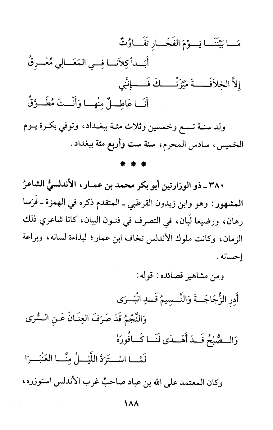 380 - ذو الوزارتين أبو بكر محمد بن عمار، الأندلسيُّ الشاعرُ المشهور: وهو وابن زيدون القرطبي - المتقدم ذكره في الهمزة - فَرَسا رهان، ورضيعًا لَبان، في التصرف في فنون البيان، كانا شاعري ذلك الزمان، وكانت ملوك الأندلس تخاف ابن عمار؛ لبذاءة لسانه، وبراعة إحسانه.