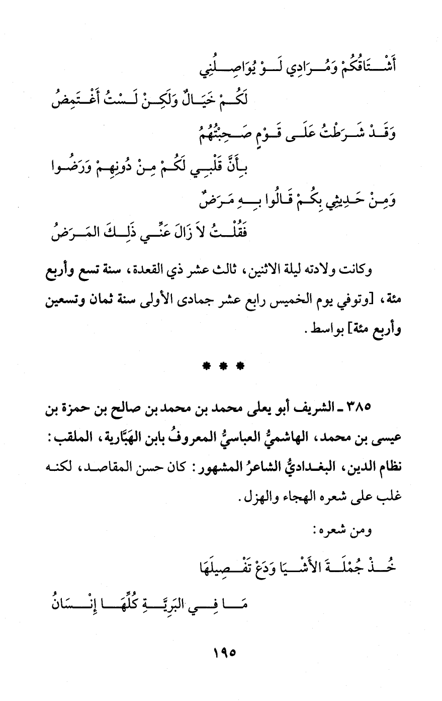 385 - الشريف أبو يعلى محمد بن محمد بن صالح بن حمزة بن عيسى بن محمد، الهاشميُّ العباسيُّ المعروفُ بابن الهَبَّارية، الملقب: نظام الدين، البغداديُّ الشاعرُ المشهور: كان حسن المقاصد، لكنه غلب على شعره الهجاء والهزل.