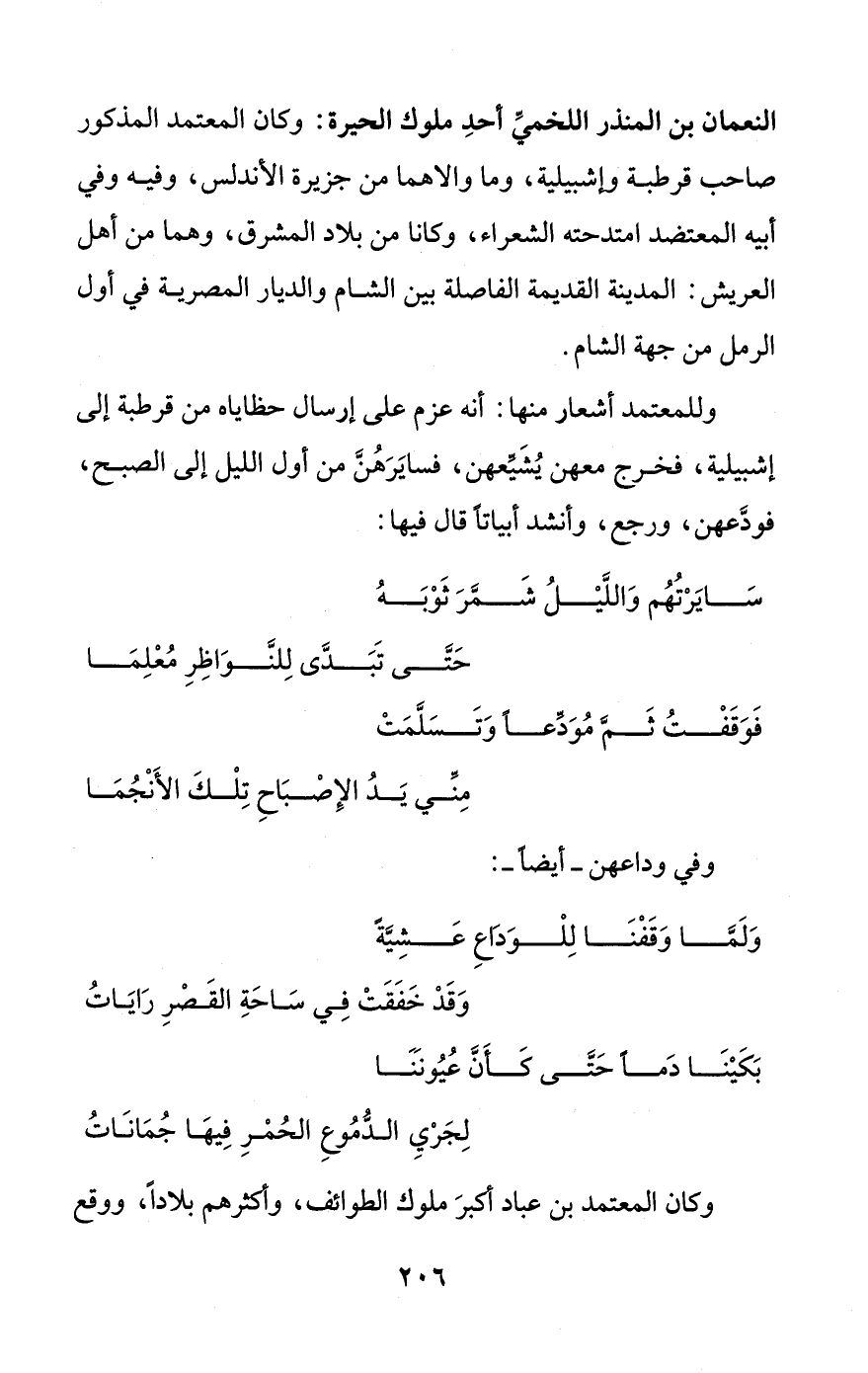 النعمان بن المنذر اللخميِّ أحدِ ملوك الحيرة: وكان المعتمد المذكور صاحب قرطبة وإشبيلية، وما والاهما من جزيرة الأندلس، وفيه وفي أبيه المعتضد امتدحته الشعراء، وكانا من بلاد المشرق، وهما من أهل العريش: المدينة القديمة الفاصلة بين الشام والديار المصرية في أول الرمل من جهة الشام.
