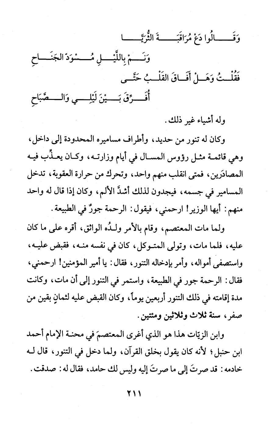 وكان له تنور من حديد، وأطراف مساميره المحدودة إلى داخل، وهي قائمة مثل رؤوس المسال في أيام وزارته، وكان يعذِّب فيه المصادَرين، فمتى انقلب منهم واحد، وتحرك من حرارة العقوبة، تدخل المسامير في جسمه، فيجدون لذلك أشدَّ الألم، وكان إذا قال له واحد منهم: أيها الوزير! ارحمني، فيقول: الرحمة جورٌ في الطبيعة.