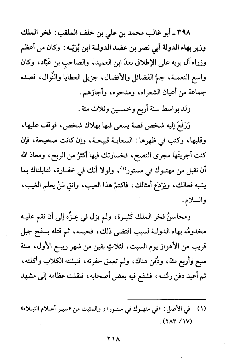398 - أبو غالب محمد بن علي بن خلف الملقب: فخر الملك وزير بهاء الدولة أبي نصر بن عضد الدولة ابن بُويه: وكان من أعظم وزراء آل بويه على الإطلاق بعدَ ابن العميد، والصاحبِ بن عَبَّاد، وكان واسع النعمة، جمَّ الفضائل والأفضال، جزيل العطايا والنوال، قصده جماعة من أعيان الشعراء، ومدحوه، وأجازهم.