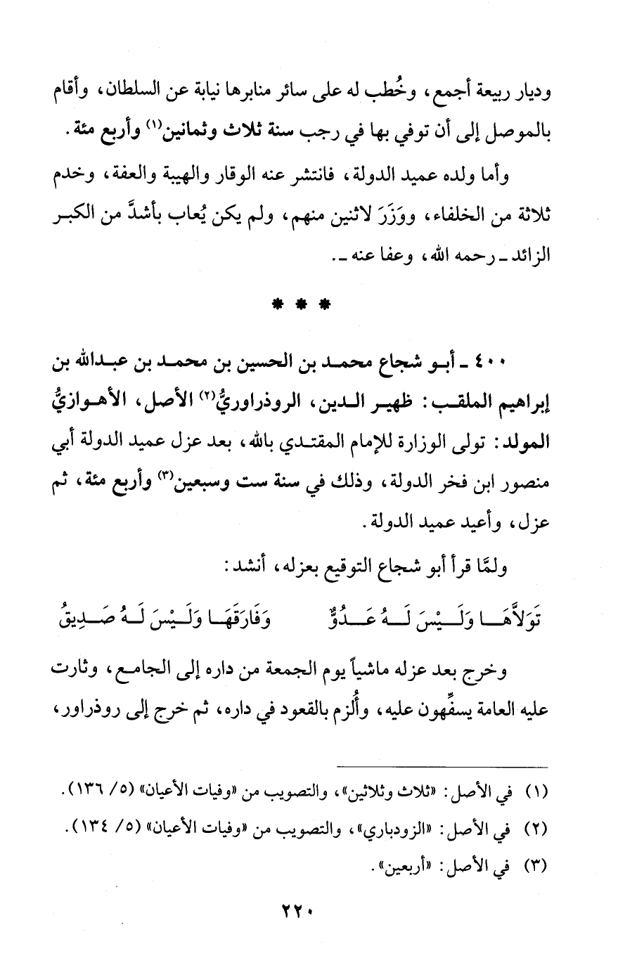 400 - أبو شجاع محمد بن الحسين بن محمد بن عبد الله بن إبراهيم الملقب: ظهير الدين، الروذراوريُّ (¬2) الأصل، الأهوازيُّ المولد: تولى الوزارة للإمام المقتدي بالله، بعد عزل عميد الدولة أبي منصور ابن فخر الدولة، وذلك في سنة ست وسبعين (¬3) وأربع مئة، ثم عزل، وأعيد عميد الدولة.